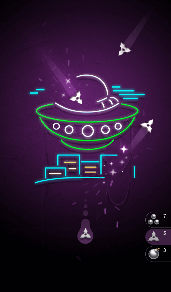 Hit the Light — красочная аркада для Android и iOS, в которой мы будем разрушать неоновые вывески, стреляя по ним различными снарядами и метательным оружием. Игра получила оригинальный дизайн локаций, симпатичное графическое оформление в рисованном стиле с использованием неоновых оттенков, отличную анимацию и приличное звуковое сопровождение. Игра разбита на многочисленные уровни, но начинается с ознакомительных, в которых нет никаких ограничений относительно количества залпов. Наша задача — разбить все неоновые трубки, из которых состоит изображение чего-либо. В качестве рисунков используются и абстрактные объекты, и портреты, и натюрморты и даже пейзажи. В общем, вполне себе настоящее искусство из светящихся трубок, которые необходимо разбивать. Стрельба производится без каких-либо пушек и стволов. Для начала надо выбрать тип снарядов и в отличие от ознакомительных уровнях, чаще всего их будет три вида, но каждого понемногу. Например, тройных ядер будет семь, сюрикена два, а пушечное
