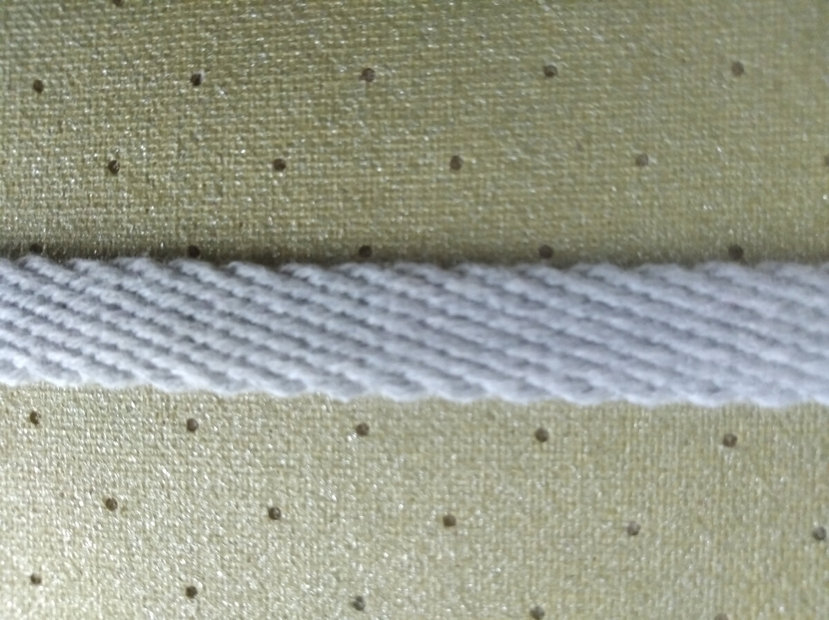 Продолжим эту тему. Вот таким х/б шнуром я пользовалась для соединения кусочков ткани. А затем еще использовала полоски ткани, пристрочив их швом зигзаг. Об этом я писала в предыдущей статье (часть 1). При изготовлении более длинных полос для окантовки изделия (короткие я сделала в прошлый раз из сиреневой пальтовой ткани, покрыв их сверху полосками тюля) я решила использовать все остатки серой костюмной ткани в полоску, даже такие, как на фото ниже. Короткие полоски ткани просто потом пришила на длинные полоски для прочности, так как эта ткань тоньше. Тюль я использовала в данном случае потому, что здесь можно было выкроить длинные полоски и закрыть все кусочки ткани. Кроме того, она подходит по цвету к основной (сиреневой) ткани, да и просто понравилась мне больше всех из того, что принесла знакомая. Окантовка изделия в готовом виде 5 см. Пришлось обметать полоску тюля (ширина ее составляла около 12 см), так как ткань редкая и сильно осыпается. Края затем прострочила, а другую сторо