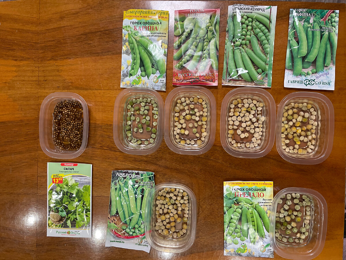 Всем доброго времени суток. На шестой день произошли некоторые изменения на комоде. Вчера, как я писал в прошлой статье, было принято решение заменить свеклу, если она никак себя не проявит за ночь. За это время никаких изменений так и не произошло. Предполагая, что так и будет, я вчера зашел в магазин и приобрел 6 сортов гороха и один сорт кинзы. На ночь поставил все семена замачиваться в растворе, чтобы на утро они достаточно хорошо набухли и их можно было высадить. Неприветливая свекла была изгнана и отправлена в мини лоток к своим товарищам, посаженным на 3 дня позже. Выкидывать её было жалко и я решил дать ей последний шанс, посмотрим, что будет через 3 дня. Её место в большом лотке занял средний лоток амаранта и мини лоток новой кинзы. Благодаря данным движениям, освободилось место на комоде под 6 лотков гороха. У некоторых сортов горошин было слишком много и они не помещались в мини лоток, поэтому был собран седьмой лоток с миксом горошка. Больше движений на комоде не было.