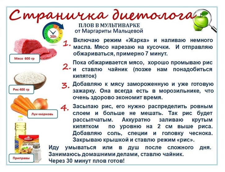 Маргарита Мальцева, наставник клиники: «Если нет дома белка, заходишь по дороге домой в магазин и берешь что-то охлажденное. Моешь руки, кладёшь в мультиварку, можно сразу с гарниром (крупа, овощи). Включаешь и идёшь раздеваться, умываться, чайник ставить или то, что делаешь обычно в первые полчаса дома. Режимы у всех разные, но еда готовится примерно 30-40 мин. Самый главный плюс — не нужно стоять и караулить. Еда не пригорит и не убежит — мультиварка готовит сама!»
