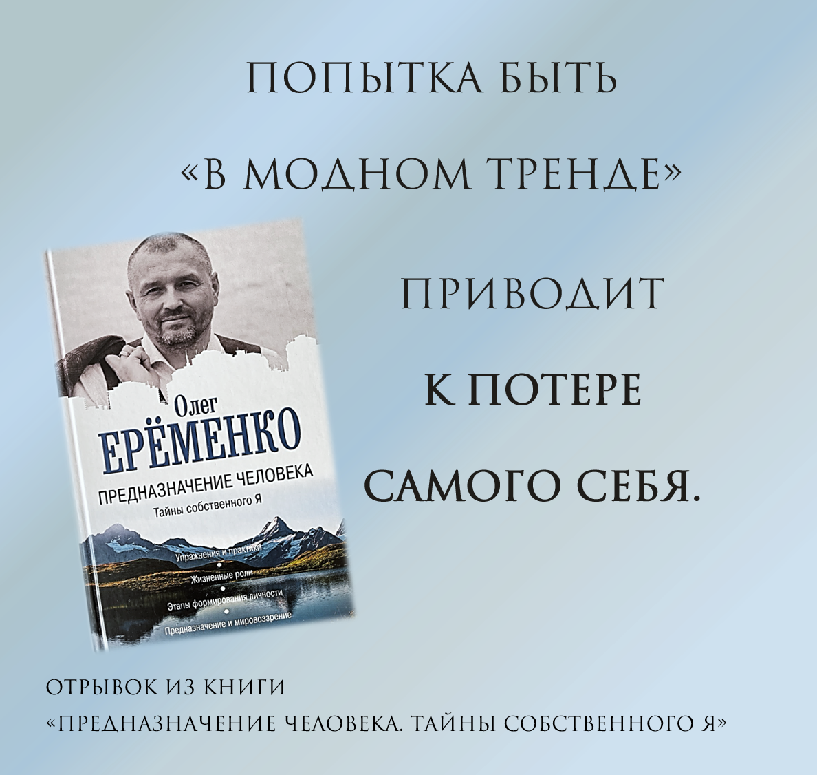 Какими бы талантами и гениальными способностями мы ни обладали, если социальная среда не позволяет их воплотить, наше призвание не будет реализовано. Бывает, что человек словно бы стыдится своих природных талантов, пытаясь имитировать и играть чужие роли, навязанные социумом. Попытка быть «в модном тренде» приводит к потере самого себя. Если человек вынужден заниматься тем, что ему не по душе, если он день изо дня ходит на нелюбимую работу и заставляет себя через «не хочу», он в результате будет испытывать постоянный стресс, чувство вины, неудовлетворение, гнев на самого себя и на внешние обстоятельства. Отрывок из книги Олега Еременко «Предназначение человека. Тайны собственного Я» #Книгапредназначение #Олегеременко #Осознанность