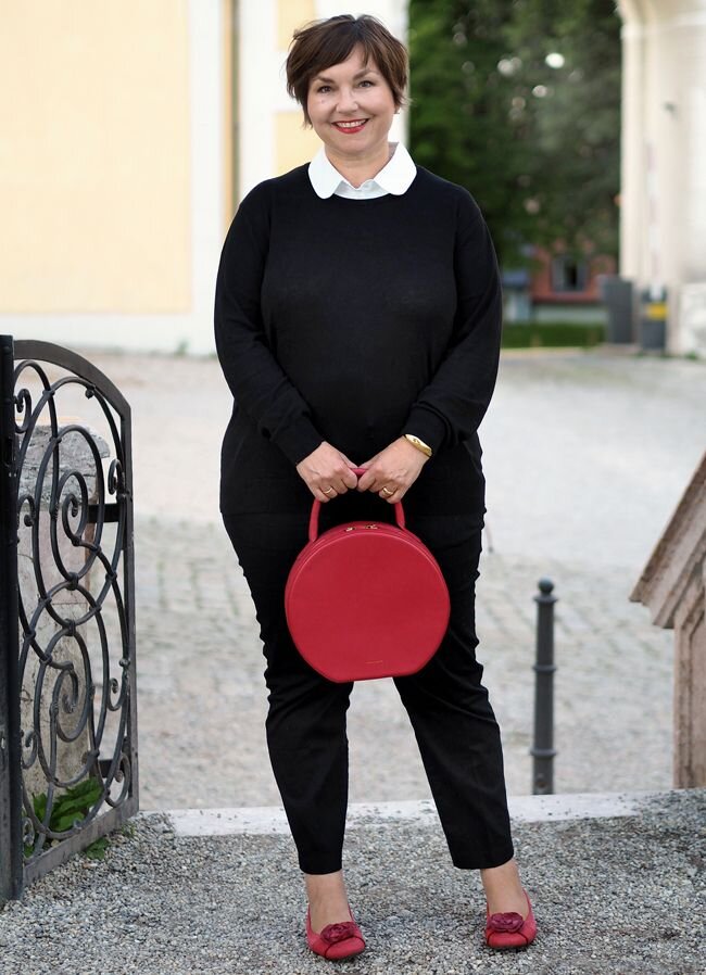 1. Чтобы хорошо выглядеть, необязательно покупать супер модные или необычные вещи. Стильным может быть и ансамбль из базовых вещей. К примеру, самый обычный ансамбль, состоящий из укороченных брюк, белой блузки с отложным округлым воротником и черного джемпера будет смотреться намного интереснее, если дополнить его яркими аксессуарами. Например, красными балетками и сумкой круглой формы того же цвета.