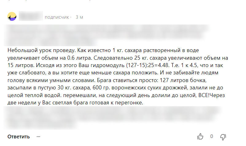 Недавно вышел небольшой спор с одним из комментаторов к статье, скрин прикреплю ниже. Речь в общем-то шла о гидромодуле сахарной браги. У меня годами отработанный рецепт. На 127 литровую бочку: 25 кг сахара, доливаю тёплой воды примерно до 115 литров и пачка (500 гр.) воронежских дрожжей сухих. Гидромодуль сей браги равен 4-4,4, в зависимости сколько воды доливать после пены. Заводятся мгновенно, первые пару часов сбиваю пену, потом доливаю воду до 122-125 литров и под гидрозатвор. Через неделю можно перегонять с недобродом в 1-3%, а если не торопит, то через 2 недели отбраживает до суха и половина бочки уже прозрачная, осветлилась. И тут мне сообщают, что я лопух и всю жизнь делал неправильно... Меня это несколько задело, может я реально олень, и пару-тройку десятков тонн браги гнал не по фен шую. Вот собственно скрин: Я прекрасно знаю, какой у меня гидромодуль и считаю его не так, а по калькулятору браги. И по этому калькулятору, для данной браги, выходит следующее: То есть гидромод