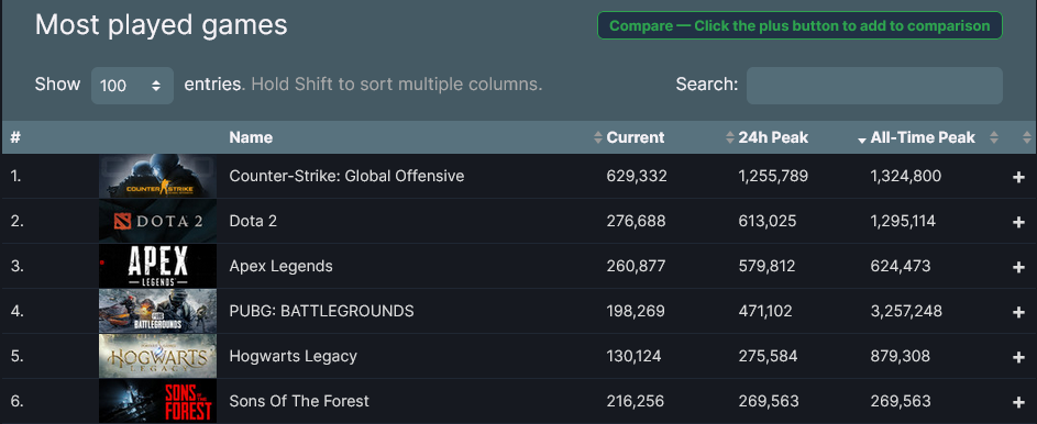 Вчера в Steam состоялся релиз сурвайвала Sons of The Forest — сиквела популярной The Forest. В первый же день игра по онлайну обогнала оригинал более чем в четыре раза. Если у The Forest максимальный онлайн составлял чуть более 76 тысяч человек, то у Sons of The Forest — почти 270 тысяч. Причем это только первый день и в выходные, вероятно, игра значительно побьет его. Это позволило игре в первые сутки вырваться на шестую позицию по популярности в Steam по онлайну. Из однопользовательских игр впереди только Hogwarts Legacy. Сама игра понравилась игрокам — 89% положительных оценок на основании более 10 тысяч ревью. Sons of The Forest доступна на PC в раннем доступе. Комментарии на сайте