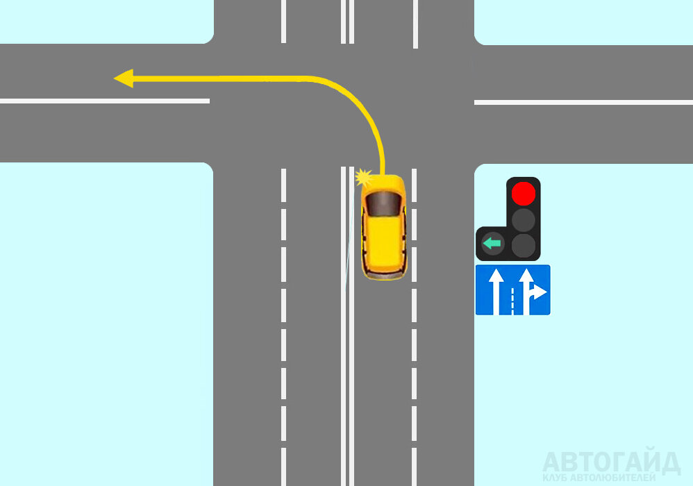 Сложных ситуаций на дороге бывает немало, из-за чего водители нередко получают штрафы. Предлагаем разобрать как раз такой билет ПДД, на который ответить неправильно могут даже опытные автолюбители. Желтая машина едет в левой полосе и приближается к перекрёстку. Водитель включает поворотник и хочет повернуть налево. Сам перекресток регулируемый: установлен светофор, основной сигнал которого горит красным. Однако стрелка на дополнительной секции горит зелёным и по сути разрешает маневр. Но есть одно но. Дело в том, что помимо светофора справа стоит еще и дорожный знак 5.15.1, который называется "направления движения по полосам". Его требование: с правой полосы проезжать прямо и направо, а с левой - только прямо. В этом и есть сложность ситуации: светофор поворот налево разрешает, а знак требует проехать прямо. Как быть в такой ситуации водителю жёлтой машины? Большинство автолюбителей предполагают, что светофоры главнее разметки и дорожного знака, поэтому поворачивать налево можно. Однак