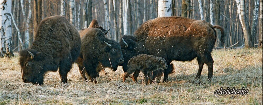 Ранняя весна. Снега уже нет, а молодых листьев на деревьях и зелёной травки ещё нет. Иду вдоль ручья за Центральным Зубровым питомником. Сквозь голые ветви деревьев всё видно далеко. У изгороди стадо бизонов ходит по поляне, желтой от прошлогодней травы. Однако в их поведении есть что-то необычное, они не пасутся, не гуляют, и на отдых это не похоже. Одна из взрослых самок явно привлекает внимание всех остальных членов семейной группы. Бизонка, озираясь, беспокойно двигается, ложится, резко встаёт, и снова ложится. Я подошел к изгороди и понял, что стал свидетелем рождения новой жизни. Все бизоны увлечены этим явлением. Моего присутствия никто не замечал, или для них я не представлял опасности. Когда родился малыш, все звери по очереди обнюхивали его, а некоторые еще и лизнули. Мать малыша вылизывала лежащего теленка и отгоняла от него наиболее нетерпеливых собратьев. Меня настолько увлекла эта картина, что я потерялся во времени. Показалось, пролетело всего мгновение, к