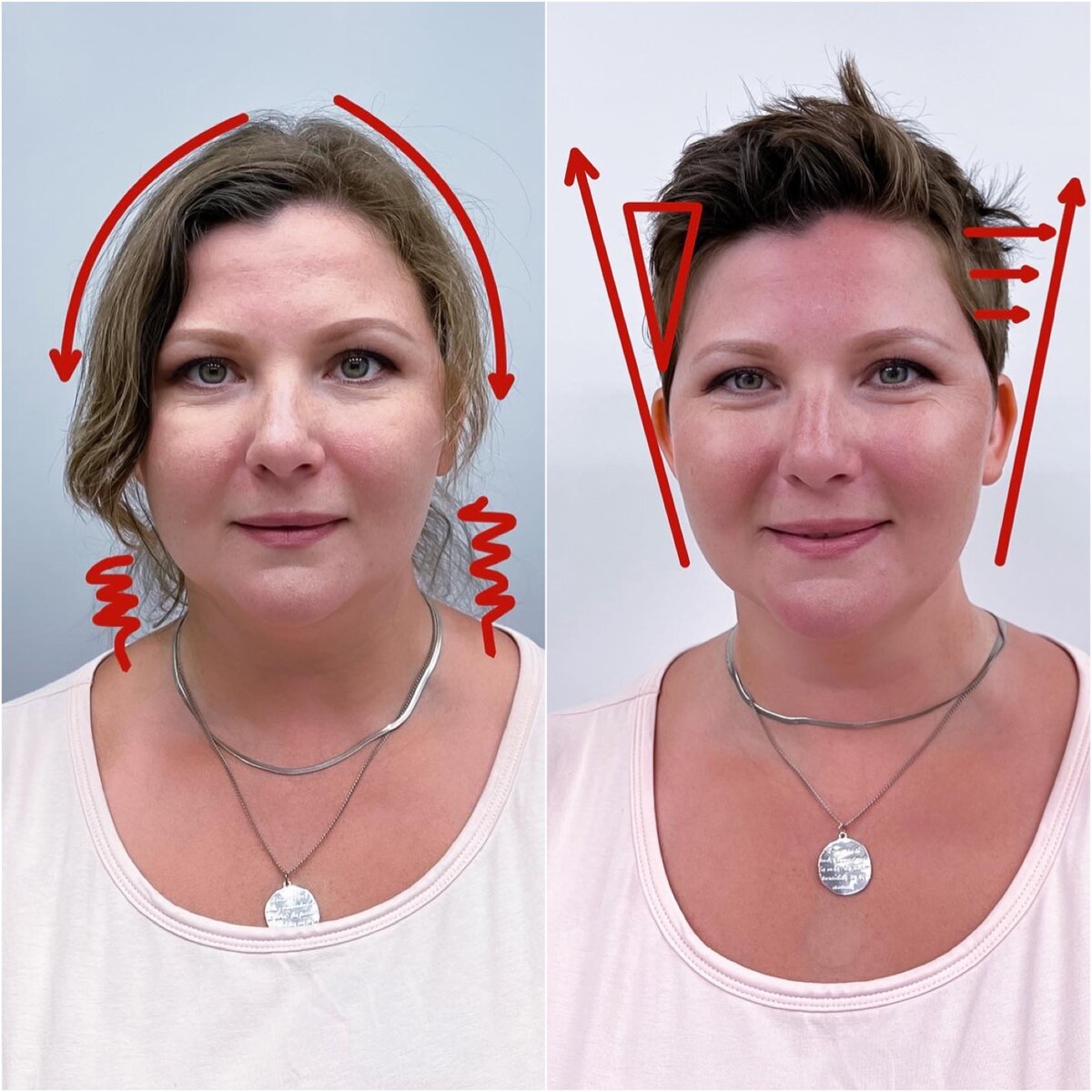 А вы знаете, что с помощью стрижки можно скорректировать форму лица? Как это сделать? Представьте овал, его верхняя часть – наша голова. Если мы хотим перенести взгляд от наших прекрасных щек на наши глаза, визуально убрать несколько килограммов и омолодить лицо, то нужно заполнить недостающие части, превращая овал в треугольник.