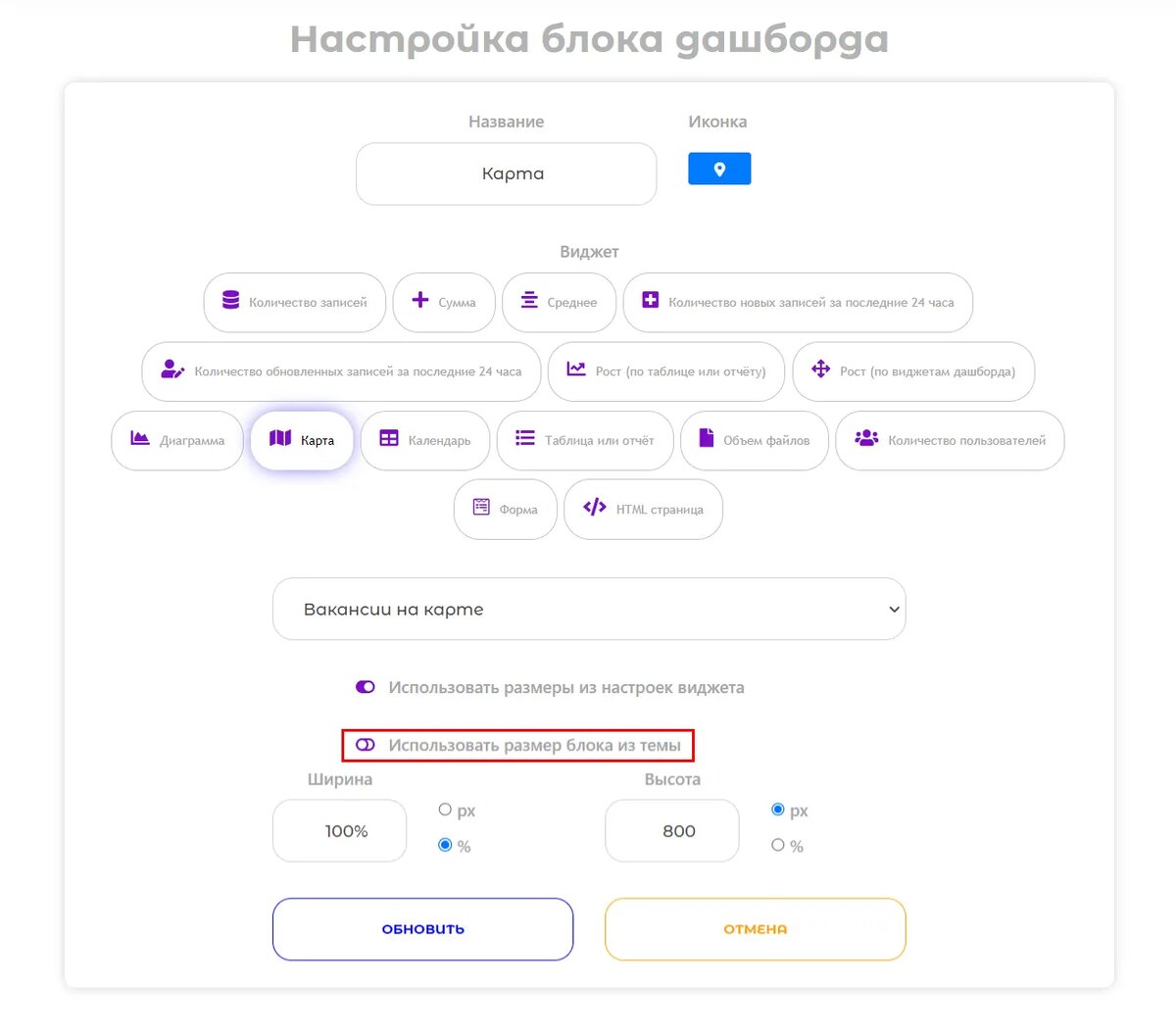 Мы добавили возможность устанавливать пользовательский размер для блоков на Дашборде. Достаточно отключить опцию Использовать размер блока из темы при создании или редактировании виджета на дашборде и ввести новый размер виджета.