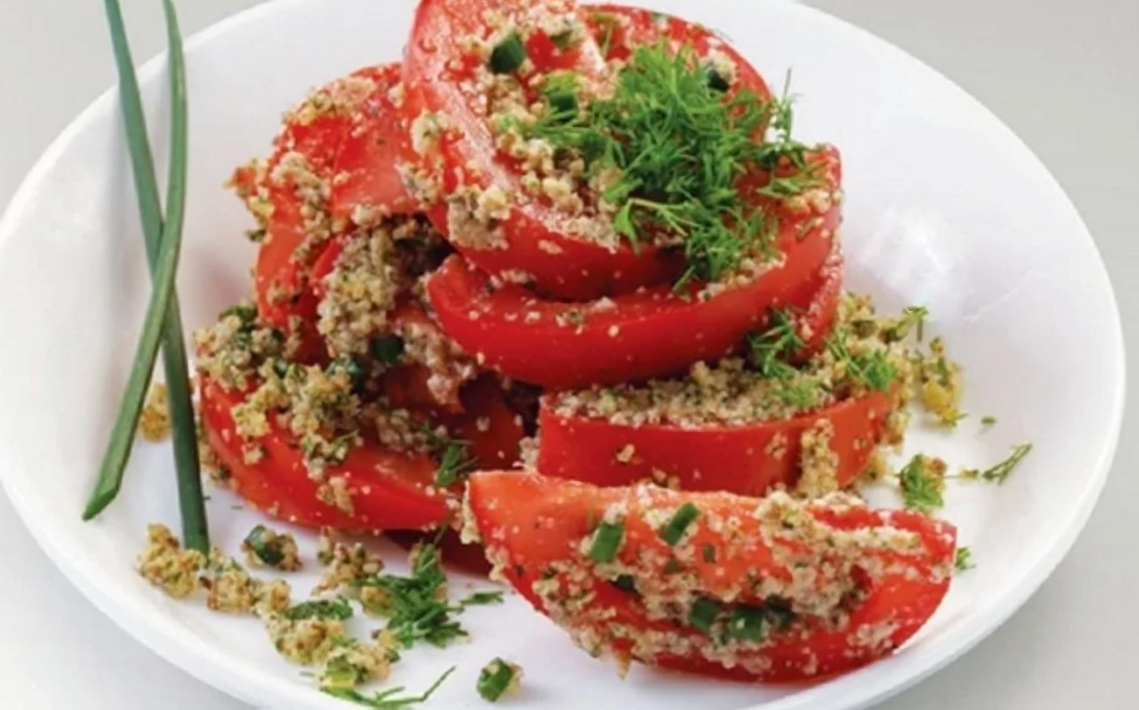 Ингредиенты: 400 г помидоров 3 ст.л. раст.масла (можно заменить майонезом) 0,5 стакана грецких орехов 1 зубчик чеснока щепотка соли зелень, сладкий перец (по желанию) Нарезать помидоры, посолить и перемешать с молотыми грецкими орехами, тертым чесноком и подсолнечным маслом. Зимой, когда помидоры совсем безвкусные, лучше заправить майонезом.
