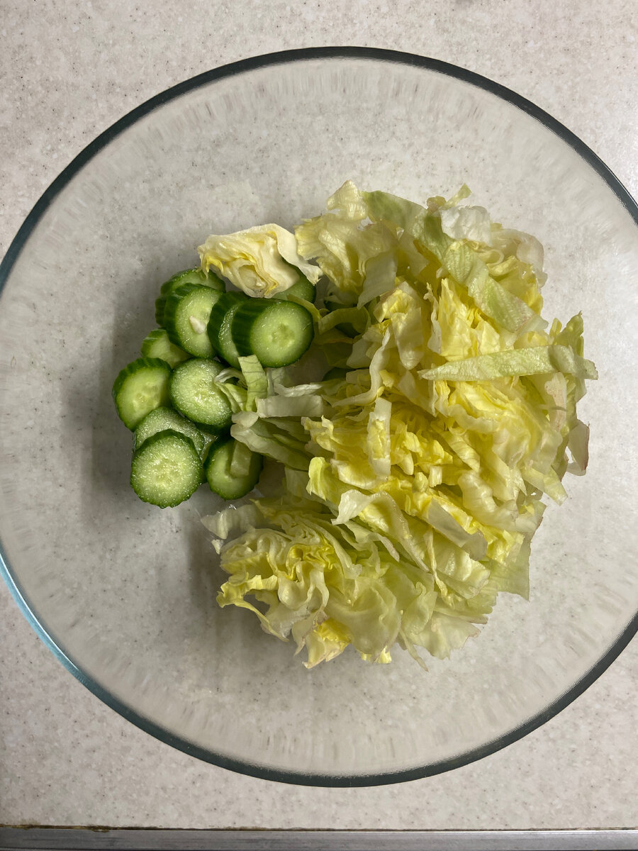 Нарезаем соломкой салат Айсберг, огурец- кольцами