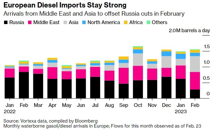 Европа все еще импортирует много топлива после введения санкций против России Европа смогла импортировать большие объемы дизельного топлива в феврале даже после введения санкций в отношении закупок в России, которая была ее главным внешним поставщиком до начала этого месяца. По предварительным оценкам Vortexa Ltd., поставки дизельного топлива немного превысят уровень января. В основном это связано с тем, что российский дефицит заполняется поставками с Ближнего Востока и Азии. Фактически, если все текущие наблюдаемые грузы за февраль прибудут до конца месяца, потоки из этих двух регионов, вероятно, достигнут самого высокого уровня по крайней мере с 2016 года. Импорт дизельного топлива в Европу остается высоким. Прибытие с Ближнего Востока и Азии компенсирует сокращение поставок из России в феврале. Источник: данные Vortexa, собранные Bloomberg. Ежемесячные поступления дизельного топлива водным транспортом в Европу; Потоки за этот месяц, наблюдаемые по состоянию на 23 февраля. Согласно п