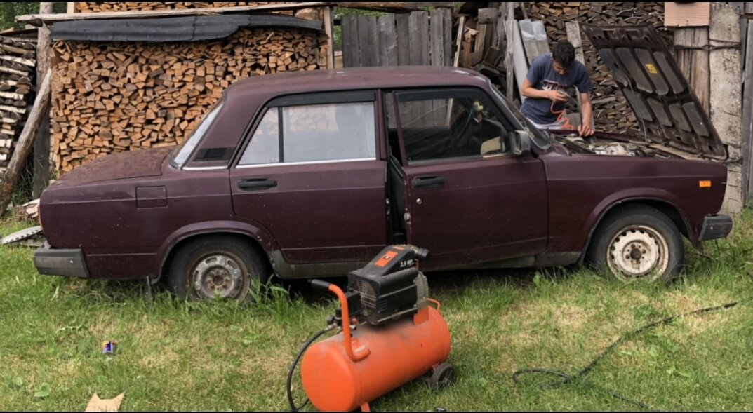 Летом мне звонит друг! И говорит: Я говорю, ну хорошо, Алексей! Что требуется от меня? Ок! Собрались с ним летом, и принялись за работу. Начали с колёс. Все четыре колеса были спущены до 0,4 - 0,7 бар. Ну, не беда - накачали в миг! Открыли капот, там нас ждала просто, осеннее царство! Очень много листьев 🍂 Ну всё сдули, почистили, погладили! Я сходил за бензином, заправил бак (залил 5 литров) Друг принёс из дома заряженный аккумулятор и установил его! Настал момент истины! Запуск двигателя! На удивление, эта бордовая бестия запустилась аж со второго раза! Это был уже результат! Попробовали съехать с места, но машина глохла. Было видно, что она вросла в землю, попробовали толкнуть, но она, вообще никак не идёт. Поняли, что не идёт она из-за переднего правого колеса. Оно застопорилось.. Сняли колесо, поняли что суппорт заклинило. Стали пытаться его разжать, но этого сделать не получалось. Отсоединили тормозной шланг. И всё равно не разжимается суппорт. Вообщем, было