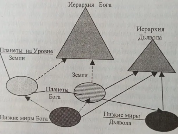 Часть вспомогательных миров принадлежит Богу, часть – Дьяволу. Во вспомогательные миры Бога приходят души, недавно созданные, с пустой матрицей, а во вспомогательные миры Дьявола поступают только бракованные души, отданные Богом Дьяволу, но уже содержащие багаж из негативных качеств.