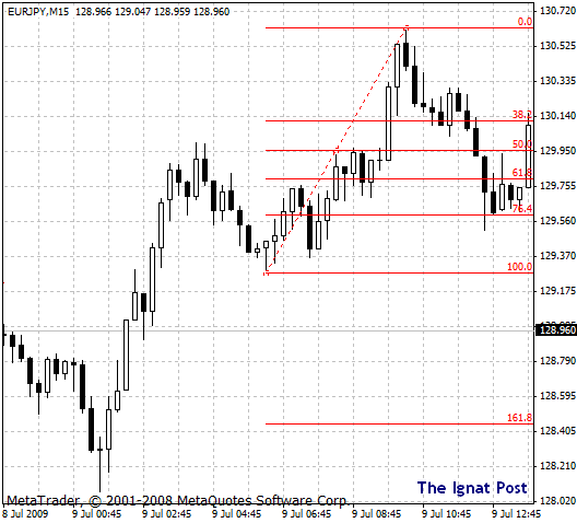 Рассмотрим рис. 1. Является ли наблюдаемый разворот на фибо-уровне 76.4 окончанием коррекции и возобновлением бычьего тренда? Если да, то является ли он подходящим местом для разворотной точки С Вил Эндрюса? Очевидно, что именно от правильности выбора разворотных точек при построении Вил Эндрюса в первую очередь зависит, будет ли с большой вероятностью достигнут целевой уровень для снятия прибыли (поскольку при корректном построении Вил Эндрюса, как мы помним, это происходит в 80% случаев).