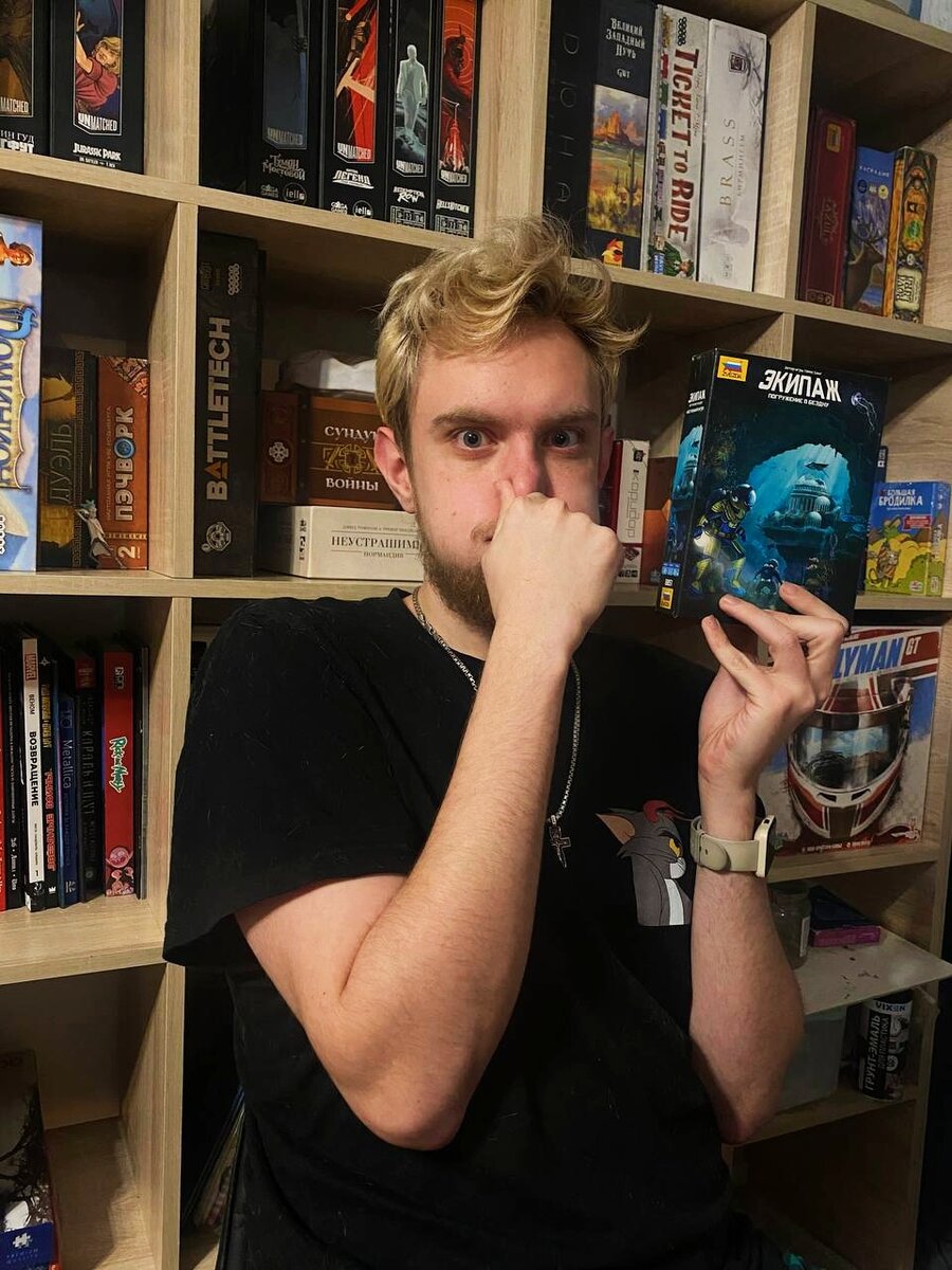 Ох уж эти кооперативные игры. Вроде бы и вы все планируете победу, но каждый думает по-своему. А главное, свой план рассказать нельзя. Сегодня я поговорю о необычном кооперативе "Экипаж". Начинаем спуск! "Экипаж" - небольшой кооператив на 2-5 игроков, основная механика которой - взятка. То есть, вы выкладывает карты, и у кого больше значение - тот и забирает "Взятку". Раунд заканчивается, когда у игроков не остаётся карт. А добавляет красок в игру то, что нельзя говорить, какие у вас есть карты на руке и задания, которые усложняют прохождение. Какие же сокровища таит внутри коробка? У игры небольшие и простые компоненты: колода карт, значением от 1 до 9, разных цветов. Плюс джокеры от 1 до 4. Плюс большая... Нет, даже огромная стопка заданий и несколько картонных компонентов. Плюс, правила и сторибук. Да, в игре есть сюжет. И он довольно крутой. От побед и поражений он не меняется, поэтому после прохождения нарратив можно опустить, повторно проходя игру. И это работает. А можно и прост