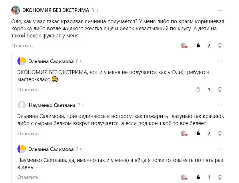 1. Правильный подбор размера сковороды. И самой сковороды. У меня антипригарная сковорода. И размер ее идеален для одновременного приготовления 4-5 яиц. Меньше - по краям будет получаться хрустящая корочка, т.к. белок растечется тонким слоем. Больше яиц положить - белковый слой будет очень толстым, прожариваться будет плохо. Поэтому на двоих с утра жарю 4-5 яиц на одной сковороде. Если завтракаем все, то жарю на двух сковородах.