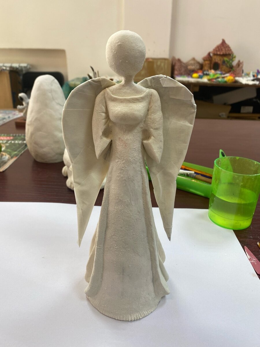 Все доброго времени суток, Дорогие Друзья! Продолжаю лепку Ангела. В заметке на сегодня, я покажу и расскажу процесс, который выполнила недавно. Последним этапом, который я показывала в видео был обработка каркаса соленым тестом, затем следовала просушка и изготовление каркасных крыльев, которые я при помощи клеевого пистолета прикрепила к спине Ангела. Следующий этап: обработка крыльев Ангела. Для работы нам будут нужны: кисть, стек, стакан с водой и соленое тесто. 1) Смачиваем поверхность крыльев водой и маленькими расплющенными кусочками теста начинаем обрабатывать поверхность крыльев. Облепить нужно будет крылья ангела с обоих сторон. Я делала это с поэтапной просушкой. Чтобы не оставить следов на слое соленого теста, я для начала обработала только лицевую часть у крыльев. По окончанию работы выглядело это следующим образом: После я оставила работу в покое на сутки, а затем долепила оборотную часть крыльев ангела. Выглядело это следующим образом: 2) Следующий этап заключался в л