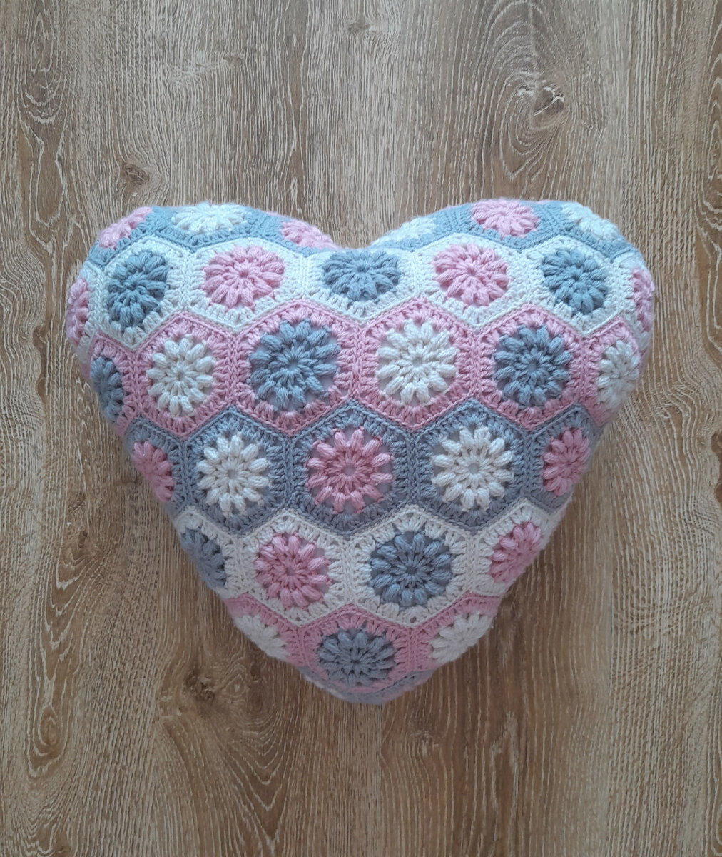 Сегодня я покажу, как вязала подушку - сердце из шестиугольников. Отлично впишется в любой интерьер. Наткнулась на такую подушку в интернете и загорелась сама ее связать. Шестиугольник можно взять любой, главное, чтобы вам нравилось. И нитки по цвету подобрать можно любые, чтобы приятно было любоваться на свою работу. Я вязала подушку на подарок. Ниже размещаю схему вязания шестиугольника. Кроме шестиугольников понадобятся квадраты со стороной равной стороне шестиугольника. Вяжем цепочку из 6-ти воздушных петель (в.п.), замыкаем в круг. Потом 4 в.п. (считается как 1 столбик с накидом и 1 в.п.), *1 ст.с/н, 1 в.п.,* повторять от * и до * еще 10 раз. Должно получиться 12 ст.с/н и между ними по 1 в.п. Вот такие квадратики у меня получились. Всего для подушки связала 64 шестиугольника и 14 квадратов. Мотивы готовы, можно собирать. Ниже расположена схема сборки. Сначала надо сшить шестиугольники согласно схеме, два нижних шестиугольника надо сложить (на схеме линии сгиба отмечены черными
