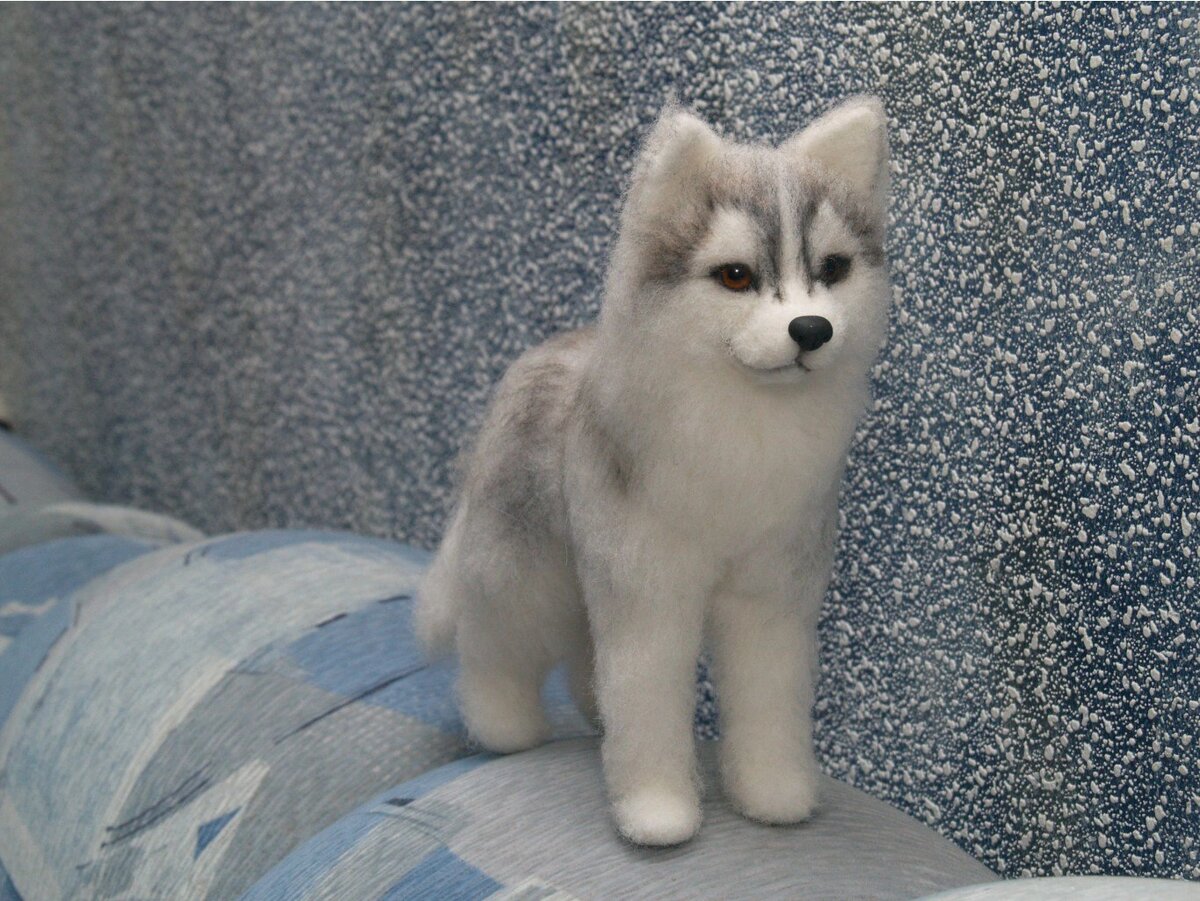 Одними из первых фигурок из шерсти были именно хаски. Небольшие, 20-25см в высоту. Делала я их на заказ по фотографиям питомцев. Например, это фото 2012 года, одна из первых работ: Не могу сказать, что в то время было мало мастер-классов по валянию, но, честно, хотелось придумать что-то своё, технику, которая будет не очень сложная, но и смотреться будет хорошо. Так и родилась идея создания этих собачек: Я брала проволочный каркас и туго обматывала его шерстью в виде ленты (гребённая лента). После - приваливала слой кардочёса, стараясь не слишком уваливать слой ленты, закрепленный на каркасе. Потом, когда анатомия фигурки меня устраивала, брала обратную иглу и аккуратно, ряд за рядом вытаскивала сквозь слой кардочёса волокна ленты. Получался эффект шерсти, как у хаски: подшёрсток за счет волокон кардочёса и ость - за счёт ленты. В этой же технике я делала и мордашки-брошки. Эта - одна из первых. Вместо стеклянных глаз, которые я использую сейчас, тут были кусочки полимерной глины с р