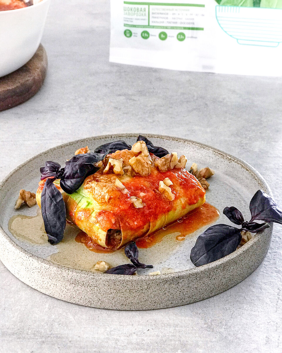 Время на приготовление 15 минут + 30 минут запекание. Выход 900 г Кбжу на 100 г 97/5/6/6 Видеорецепт ждёт вас внизу страницы ⤵️ Ингредиенты: Кабачок свежий 1 шт Рикотта 80 г Шпинат замороженный 100 г Паприка 1/2 ч л Вяленые томаты 50 г Протертые томаты 400 г Моцарелла 1 шарик Грецкие орехи Оливковое масло Соль, перец - по вкусу Подписывайтесь на наш канал- вас ждут простые проверенные рецепты салатов, горячих и холодных блюд, множество десертов и закусок каждый день в разных форматах! Выбирайте удобный для вас. Мы в Телеграм, вконтакте, Instagram* и Facebook* Где купить товары "Планета Витаминов"? ✅Рецепт: 1. Для начинки соедините размороженный и нарезанный шпинат, отжатый от жидкости, рикотту, паприку и нарезанные вяленые томаты. Соль и перец добавьте по вкусу. Перемешайте. 2. Кабачок нарежьте тонкими слайсами, сложите по три полоски в горизонтальном и вертикальном положении. В центр выложите начинку. Закройте начинку кончиками слайсов, как показано на видео. 3. Аккуратно улож