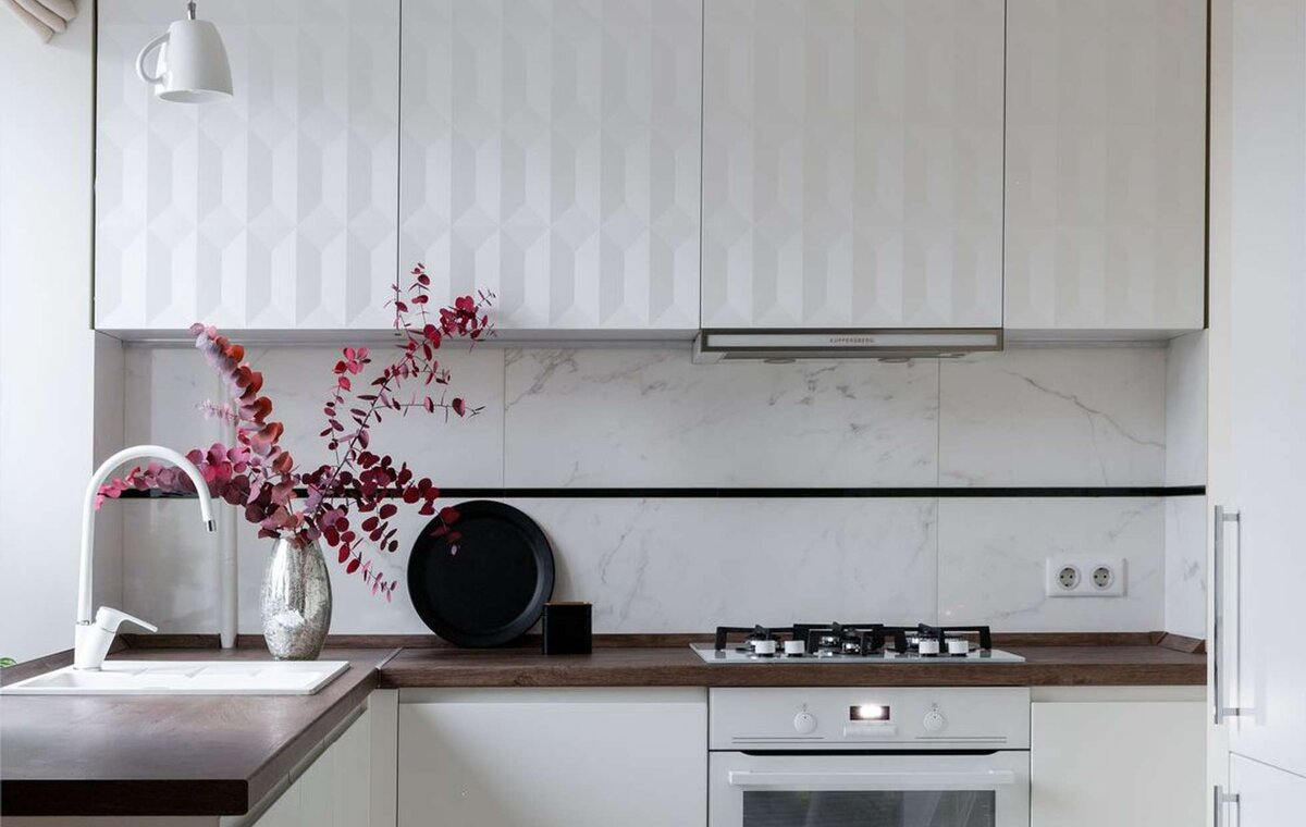 Кухня — всего 5,5 квадратов, но ее наполнили всем необходимым. Благодаря перепланировке нашлось место для встроенного холодильника. Гарнитур разместили углом — одна из сторон находится прямо под окном, куда вывели мойку. Верхние шкафы — только по одной стене.