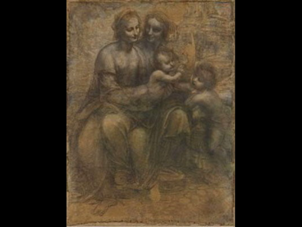 Произведение очень большого размера, состоит из восьми склеенных вместе листов бумаги. Также известный как мультфильм Берлингтон Хаус, предполагается, что это эскиз при планировании картины, хотя картина либо больше не существует, либо никогда не создавалась. Леонардо часто использовал "карикатуру", подобную этой, в качестве трафарета, который он наносил на предполагаемую поверхность картины. После закрепления на месте булавка использовалась для создания контура, который затем направлялся кистью художника. Поскольку эта часть безупречно сохранилась, предполагается, что она никогда не использовалась для этой цели.