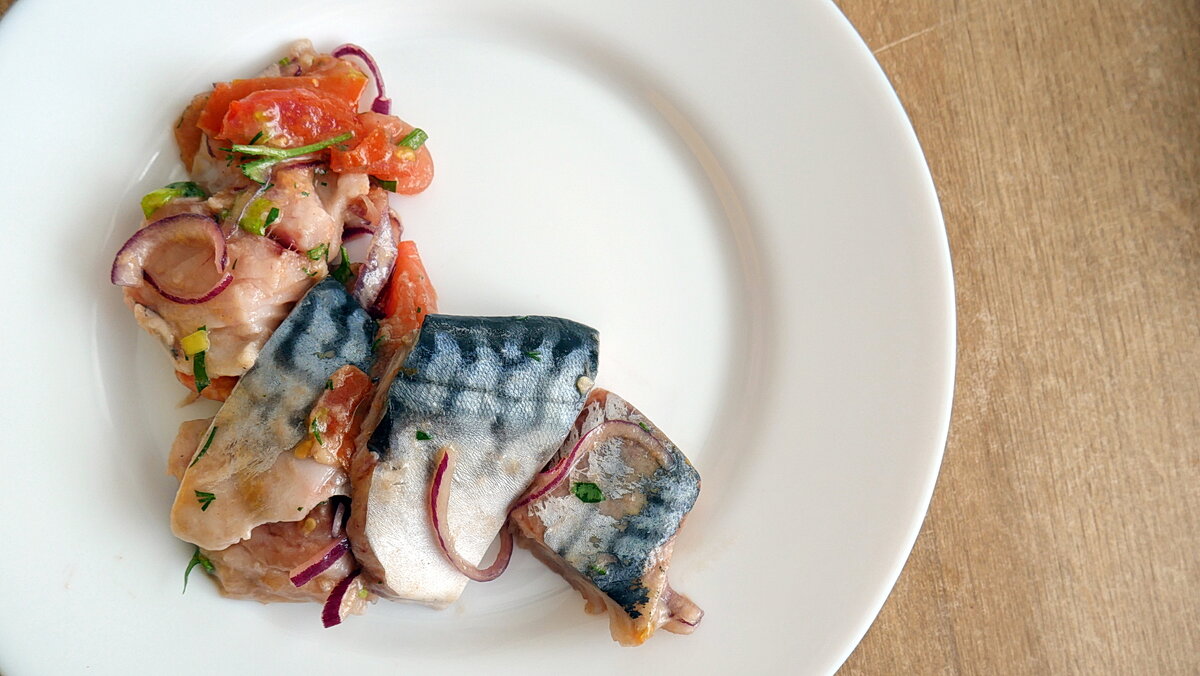 Доброго вам дня, дорогие читатели! 😊 Несколько дней хочется рыбу, поэтому несколько дней ее и едим в перерывах между мясом. Малосольная красная рыба, запеченная красная, жареные сиговые, уха. И захотелось чего-то другого. Поэтому накануне вечером заказал скумбрию и сельдь, чтобы скумбрию к обеде приготовить. Подобным образом готовлю скумбрию довольно регулярно, просто иногда меняя состав маринада. Про этот еще не рассказывал. И, да. Перед приготовлением маринада хорошо бы разделать скумбрию н филе снять пленку с внешней стороны. Рыбу при этом лучше не мыть, чтобы не было контакта филе с водой. То есть до разделки ее можно ополоснуть, главное, чтобы вод не попала внутрь рыбы. Это самый сложный этап приготовления. Все остальное – элементарно. В состав маринада входят: Про пропорции спрашивать не надо – балансируйте маринад по своему вкусу. Помидоры лучше порезать дольками, а лук – тонкими полукольцами. Перед закладкой рыбы смесь в чаше хорошо размять, чтобы было побольше сока. И потом