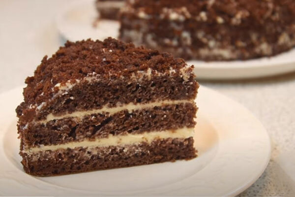 Ингредиенты: Для коржей: Кефир — 300 мл Мука пшеничная — 280 граммов Сахар — 200 граммов Разрыхлитель для теста — 10 граммов Масло растительное — 350 граммов Яйца крупного размера — 2 яйца Какао порошок — 20 граммов (2 столовых ложки) Ванилин на кончике ножа. Можно заменить одной чайной ложечкой ванильного сахара Сода питьевая — 1/4 чайной ложечки Соль — 1 щепотка Для пропитки: Вода питьевая — 3 столовых ложки Сахар — 2 столовых ложки Коньяк — 1 столовая ложка. Этот пункт можно пропустить Для крема: Масло сливочное — 200 граммов Молоко сгущеное — 1 стандартная баночка (380 — 360 граммов) Кефир охладить и растворить в нем соду. Если кефир кислый, соды можно взять больше. В другую миску всыпать муку и какао порошок. Добавить разрыхлитель. Перемешать сухую смесь до однородности. Затем смесь просеять. В чистую миску разбить яйца. Постепенно добавляя сахар, ванильный сахр и соль, взбивать миксером до побеления массы. Очень долго взбивать не нужно. Затем вмешать растительное масло. При эт