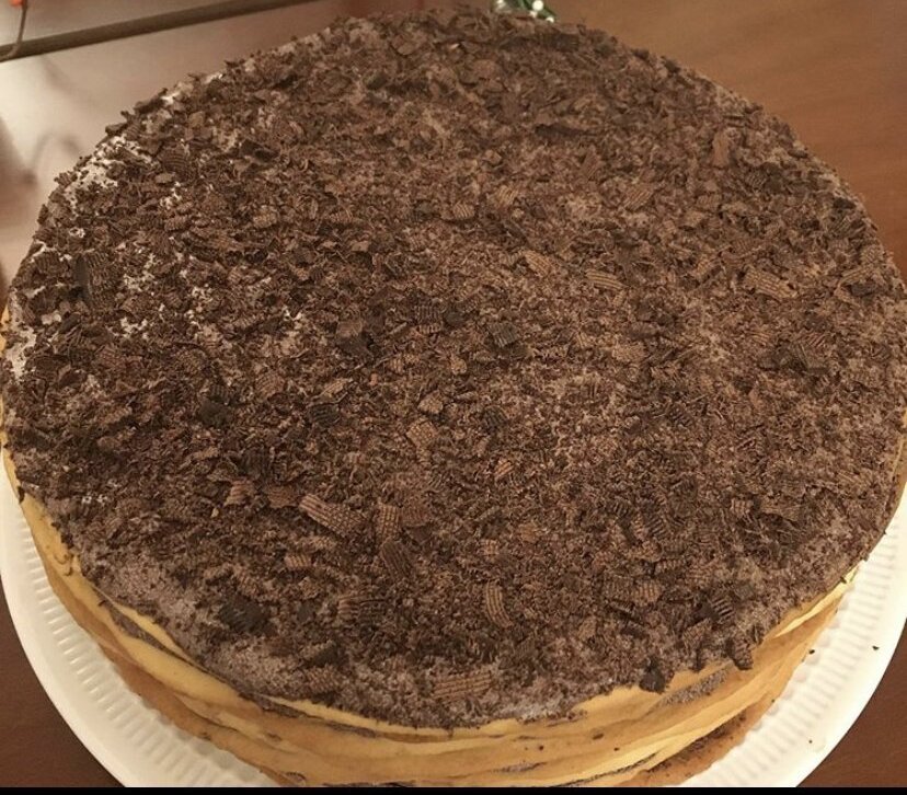 Ингредиенты Для Крема яичные желтки 3 шт. сахар 1 стакан молоко 400 мл какао 4 ст. л. молоко сгущенное вареное 2 банки сливочное масло 500 г Для Коржей сливочное масло 150 г яйцо 2 шт. сметана 500 г сода 1 ч. л. мука 900 г Дополнительно шоколад горький 100 г Сначала нужно приготовить крем: желтки растереть с сахаром... Добавить молоко и какао.Постоянно помешивая варить до пузырьков, но не кипятить!!! Охладить. хорошо перемешать. Масло, комнатной температуры, взбить с варенной сгущенкой. Добавить шоколадный крем, хорошо перемешать и охладить. Теперь готовим тесто: масло взбить, по одному добавить яйца. Сметану смешать с содой, и когда сметана запузырится добавить к яичной-масляной массе. Постепенно добавлять просеянную муку (у меня ушло примерно 5 стаканов по 250 мл)... И замесить гладкое тесто. Тесто разделить на 8-12 частей (у меня получилось 9). Тонко раскатать каждую часть... Выпекать в духовке при 180 градусах до бледно-золотистого цвета. Я выпекала по 3 коржа примерно 15-20 минут.