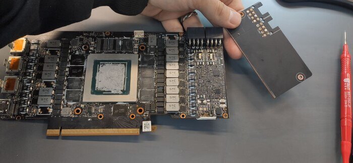 Привет читателю! Это фотка для затравки, по этой карте, надеюсь, дойдут руки видео снять) Один пикабушник прислал на ремонт свою красавицу, которую взяли с Китая новой: Это gigabyte rtx 3080 ti gaming oc, я уже делал краткий обзор на карты этого производителя. Краткая предыстория: "Есть Gigabyte 3080Ti, брал на Али, на днях был внезапный черный экран под нагрузкой, картинка пропала, но комп работал, все вентиляторы на максимум включились, кнопка power не реагирует. Выключил БП, и снова при включении комп не стартует вообще, БП издает 2 щелчка и все. БП 850W gold. На более простом БП в другой сборке с этой видеокартой комп стартует". Тут есть всего одна ошибка, которую допустил владелец - если блок питания не хочет запускать компьютер, то не стоит его заставлять это делать. Как я и писал в обзоре конкретно у версии gaming от гигабайта есть предохранители, но они в нашем случае не спасли: И даже внешне дефект виден: Это одни из самых худших дрмосов на топы 3ххх, которые стоят в данных ка