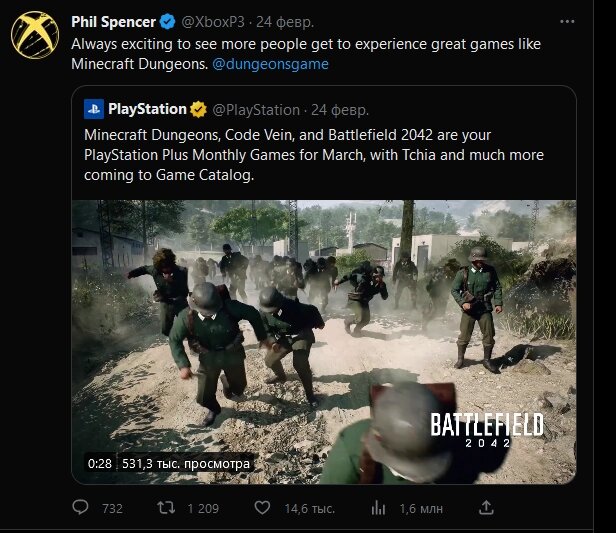 Неожиданной для всех глава игрового подразделения Xbox Фил Спенсер в своем Twitter-аккаунте прокомментировал мартовскую подборку игр своего главного конкурента — сервиса PS Plus. Но внимательные геймеры быстро догадались, что таким образом Спенсер лишь подчеркивает тот факт, что игра Minecraft Dungeons по-прежнему доступна игрокам на консолях от PlayStation, и никто ее не забирал после покупки Microsoft Mojang Studios. Также игра полностью доступна на консоли от Nintendo — Switch. Это недвусмысленный намек на то, что серия Call of Duty также никуда не денется с PlayStation после того, как “Майки” купят Activision Blizzard.