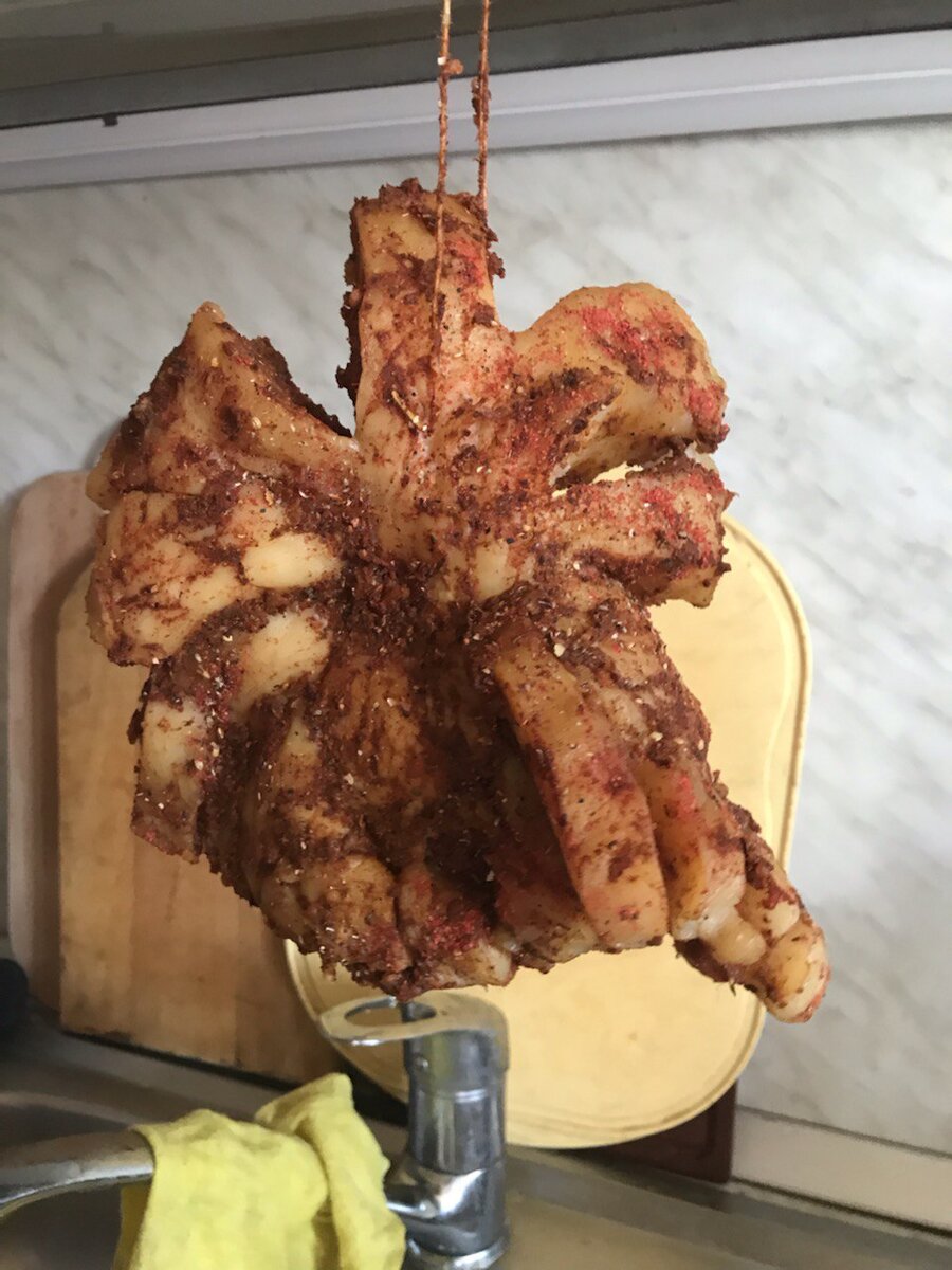 Всем привет. В этой статье расскажу о приготовления курдюка холодного копчения со специями. Берём курдюк молодого барашка, промываем, прорезаем весь курдюк на маленькие кусочки, но не отделяем от общей массы. Полностью засыпаю солью и оставляю солиться минимум дней на 5. После просолки я отряхиваю курдюк от соли, можно промыть, но после промывания надо чтобы он просушился (обвялился). Затем я его помещаю в коптилку холодного копчения минимум на сутки, после копчения обязательно даём отдохнуть и чуть чуть проветрится от лишнего запаха и дыма. Обязательным условием является использование специй и чеснока. Специи я использую следующие: красный, душистый и чёрный перец, паприка, хмели сунели, чеснок. Предварительно подавив чеснок и обильно обмазав им курдюк, засыпаем специями, заворачиваем в пергаментную бумагу, чтобы лишняя влага могла впитаться и оставляем в холодном помещении или холодильнике на несколько дней, чтобы аромат полностью раскрылся и пропитался внутрь. Такой продукт я н