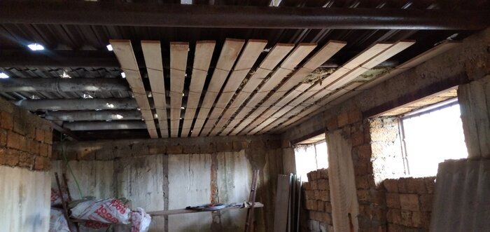 Всем привет, уважаемые господа. Хочу поделиться слайдом фото, как мы делали себе потолок первого этажа в кухне с нуля и до финала. У нас на армопоясе лежат не деревянные, а металлические балки. Сверху на втором этаже будет деревянный пол, об этом в следующих постах. 1. Мы начали обрешётку первичную потолка. Балки длиной 6м крепили к трубам, а между укладывали минеральную вату как утеплитель. Перед этим всё окрасили грунтовкой по металлу с ржавчиной. 2. Закончили обрешётку. На будущее конечно лучше сделать вплотную все доски, этот момент уже поняли когда закончили:) вторую часть дома будем делать вплотную. 3. Прикрутили поперечные рейки, на которые по разметкам лазерного уровня прикрутили крепёж для направляющего профиля гипсокартона. 4. Закрепили стеновые направляющие для профиля. 5. Начали устанавливать профиль на крепления. Пробовали блохами, но они всё прокручивались через одну, заморочились посадили всё на маленькие болты с гайками. Надо было брать профиль дороже, который толще:) 6