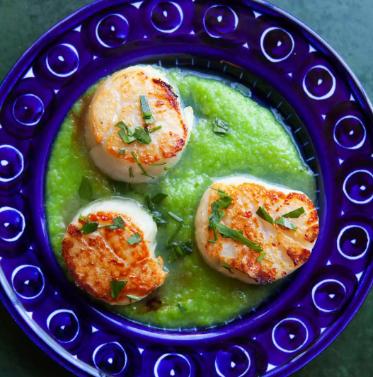 Изысканное блюдо из обжаренных морских гребешков в идеальном сочетании с восхитительным густым соусом из спаржи. На самом деле это элегантное блюдо содержит всего несколько ингредиентов и его легко приготовить в домашних условиях, но только, если вам известны его секреты! Идеально использовать свежие морские гребешки, купленные в тот же день, когда вы собираетесь их готовить. Если же вы используете замороженный продукт, то советую размораживать гребешки постепенно, погрузив их в молочную смесь (1 стакан молока на 1 стакан воды). Еще один секрет заключается в приготовлении моллюсков на сильно раскаленной сковороде, так как в гребешках много влаги и это позволит быстро нагреть и высушить внешний край моллюска, что существенно облегчит переворачивание. Ингредиенты: Способ приготовления: 1. Хорошо посолите морские гребешки и отложите в сторону при комнатной температуре, пока вы готовите соус из спаржи. 2. Используйте картофелечистку, чтобы срезать внешний слой со спаржевых копий. Нарежьте
