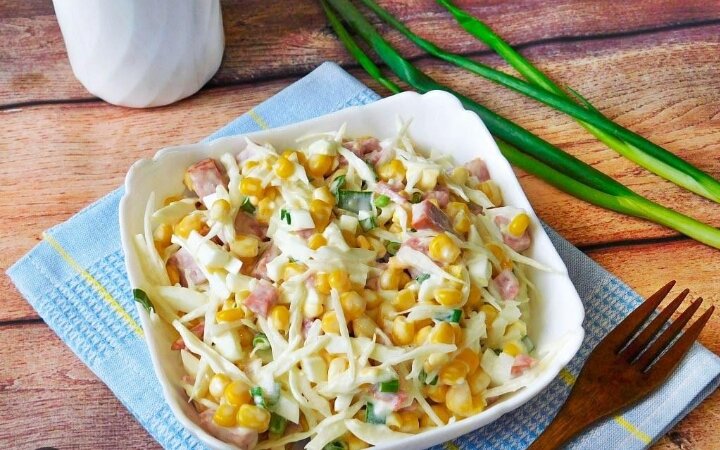 Этот салат очень лёгкий и очень сытный. И гости будет восторге от этого салата. Ингредиенты!!! Капуста -300грм Свежий огурцы -1-2шт Колбаса копчёная -500грм Яйца -5шт Кукуруза концентрированный -1банка Соль-перец по вкусу Майонез Чеснок- 2зубчика Яйца отварите вкрутую остальное все соломкой нарежьте выдавите чеснок заправьте майонезом салат готов🥗♥️