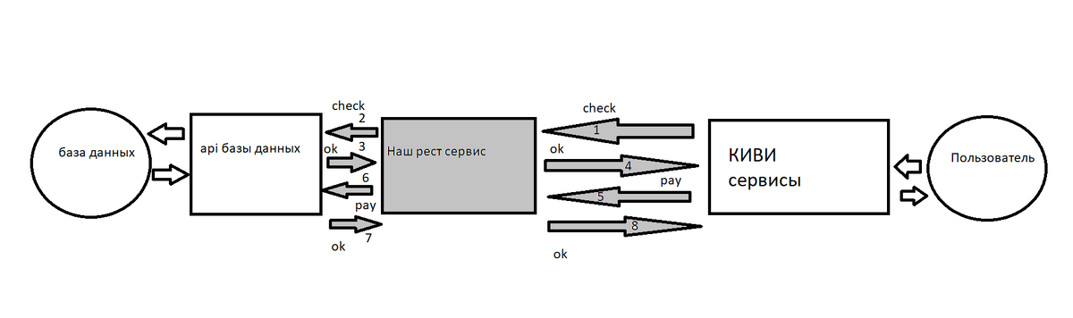В этом цикле статей я реализую не учебное, а реальное приложение, которое будет работать в проде. Приложение будет интегрировать киви сервисы по оплате с нашей БД. Роль БД будет выполнять сервис, который не могу открыть, т.к. это не учебный пример. Вот схема работы приложения (серый цвет - будем реализовывать): Суть проста. По этому принципу интегрируется много платежных сервисов. После реализации киви платежей будем интегрироваться со Сбером. Описание: 1) Пользователь хочет совершить платеж (или покупку) 2) Сервисы киви отправляют на наш рест сервис команду check (проверка возможности транзакции). Рест сервис проверяет возможность оказания услуги через сервис БД (статус пользователя, сумма и т.д.). 3) Отвечает киви сервису, "можно совершить платеж" (ok). 4) Приходит команда pay - мы заносим информацию о платеже в БД. 5) Возвращаем в киви "ок" - т.е. платеж занесен и деньги переводятся на подключенный нами счет. Весь цикл команд (check - pay) - это единая транзакция и чтобы она была в