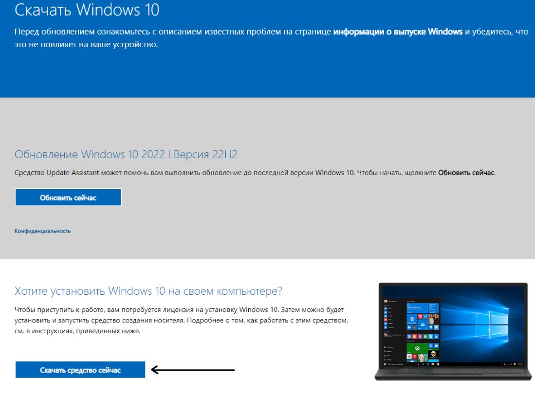 Заходим по ссылке https://www.microsoft.com/ru-ru/software-download/windows10 и скачиваем официальную утилиту от Microsoft - Media Creation Tool. Нужно нажать "Скачать средство сейчас" как указано на скриншоте