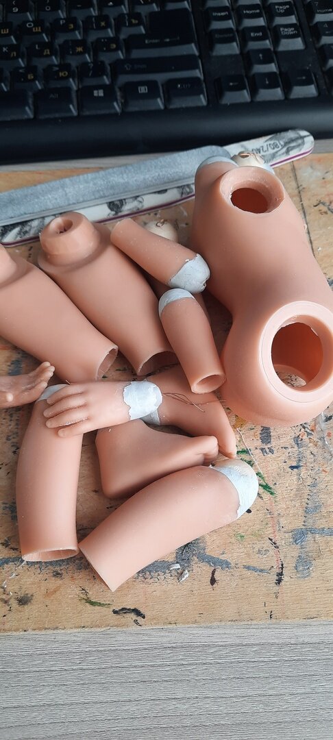 Здравствуйте. Продолжаю рассказывать про приключения с ошарнириванием родного тела Паолки. Начало здесь: После всех манипуляций, у меня получилась вот такая кучка запчастей. Все это складывалось во вполне приличное тело. Вторую картинку в карусели это не я, это сын)))). Попросила закрыть смайликом для Дзена. Закрыл. В общем-то оставалось решить вопрос покраски шарниров. Здесь были два определяющих момента. Первое - моделайт при трении легко стирается, а шарниры, как ни крути, часть весьма подвижная. Такой вот каламбур. То есть краска должна давать еще и дополнительную прочность. Второй момент. Моделайт от винила отходит и образуются щели. Их тоже надо заделывать, затирать, заполнять краской. Поэтому я решила покрыть шарниры камуфлирующим полигелем для наращивания ногтей. Твердый, вандалоустойчивый, сцепиться должен хорошо и щелки заполнит. Очень обидно, что ничего не вышло, ведь подобрала точно в цвет винила. Так и не поняла от чего. Сох гель плохо и легко сдирался при небольшом ус
