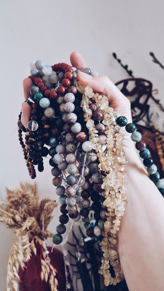 Ранее я поднимала вопросы энергетики различных форм камней, и вот теперь пришла очередь украшений. Если дикая форма камня несёт в себе естественную, природную, необузданную энергию, то придавая различные формы человек укрощает эту энергию под свои запросы, адаптирует для более успешной сонастройки с камнем, и самая податливая из них, пожалуй, это форма бусин. Чтобы получить бусины порода проходит через длинный путь. Большие куски камня с помощью специальных агрегатов нарезаются на на пластины, потом на палочки, далее на кубики, эти кубики в галтовачных машинах обтачиваются до округлых форм, а уже потом окончательно доводятся до идеальной формы шара. Подогнав эти шарики по размеру в них просверливаются дырочки. Путём этих манипуляций человек полностью подчиняет себе природу камня, а нанизывая их в определенной последовательности в украшениях мы окончательно приучаем камень к спокойному и плавному воздействию на человеческое биополе. По такому же принципу действуют и кабошоны, с той