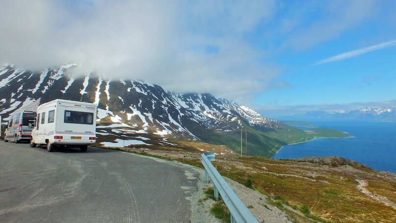 Ничего приемлемого не нашли, вернулись и повернули направо. Через перевал выехали на смотровую площадку, очень было высоко и красиво над водой, вокруг горная гряда и океан.