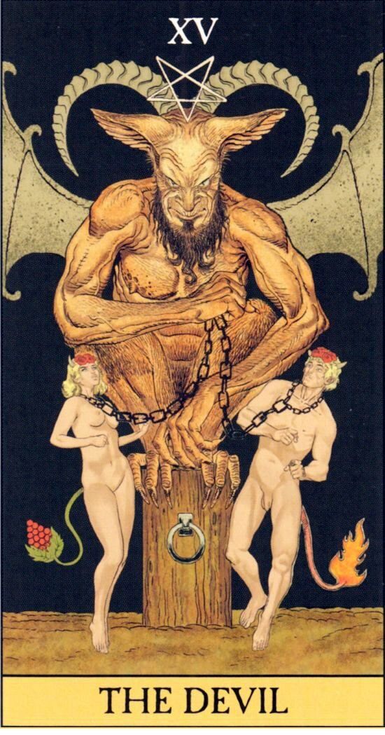 Дьявол – есть неизбежная тьма, которую отбрасывает любая вещь, когда её касаются лучи света. Без тьмы нет и света, так и не может быть добра без зла, иначе мир превратился бы в бесконечное смешение различных оттенков серого цвета. Не стоит бояться Дьявола, ведь зло – часть сути каждого человека, и оно есть во всех. Другое дело, что одни учатся укрощать его, а другие дают ему волю. Классическое изображение. Карта Таро Дьявол предстаёт в образе Бафомета с рогами и пятиконечной звездой. Одну руку он поднял, другую же с факелом опустил вниз. Внизу карты предстают Влюблённые, которые уже вкусили запретный плод и были низвергнуты с Небес. Они прикованы цепями к чёрному постаменту, на котором сидит Дьявол. Общее значение карты Значение прямой и перевёрнутой карты Подробное толкование карты в разных гаданиях мы рассмотрим ниже, а пока вот короткое значение карты Дьявол, прямой и перевёрнутой. Дьявол прямой. Дьявол Таро указывает на то, что человек сбился с пути. Мысли и действия ведут