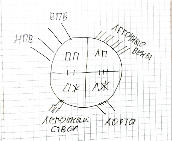 Строение сердца Сердце имеет 4 камеры: 2 предсердия и 2 желудочка. Сверху находятся предсердия, а снизу желудочки Что входит, а что выходит? В левое предсердие впадает 4 лёгочных вены, а в правое верхняя и нижняя полые вены. Из левого желудочка выходит аорта. Из правого желудочка – лёгочный ствол, который разделяется на две лёгочной артерии. Клапаны Между левым предсердием и левым желудочком находится митральный клапан(две створки). Между правым предсердием и правым желудочком – трикуспидальный клапан(три створки).Эти клапаны называют атриовентрикулярными, потому что они расположены между предсердиями и желудочками. В клапанах легочного ствола и аорты, которые ещё называют полулунными клапанами, три створки Рисунок: Честно, я не особо красиво рисую, но для вас я постарался отразить все моменты данной темы на рисунке, представленном ниже ВПВ – верхняя полая вена ПП- правое предсердие ПЖ- правый желудочек НПВ- нижняя полая вена ЛП – левое предсердие ЛЖ – левый желудочек Задание: Нарис