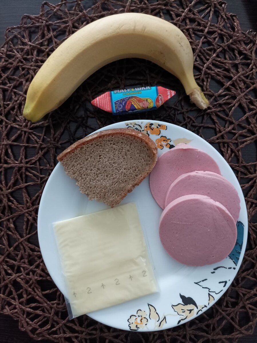 Завтрак Банан отложен на полдник. Вот такой завтрак. Первый прием пищи составили 3 куска колбасы, темный хлеб и сыр. Чай и десерт.