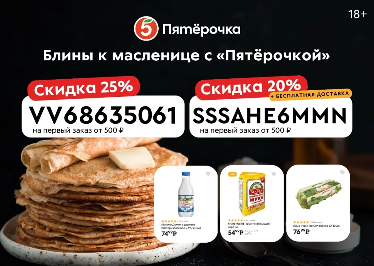 Масленица на дворе — блины на столе! Овсяные, гречневые, ржаные. Дрожжевые, ажурные, пышные. А какие блины вы любите больше всего? Уже купили все ингредиенты для приготовления самых вкусных блинчиков? Мы приготовили промокоды, чтобы вы не отвлекались на магазины. Все продукты в Пятёрочке. Закажите — привезем! Это удобнее и выгоднее, чем ходить самому. https://5kanew.prfl.me/60681bca8f567a4bcf706e4c/d325bd8ab97c SSSAHE6MMN - скидка 20% + бесплатная доставка на первый заказ от 500₽. VV68635061 - скидка 25% на первый заказ от 500₽.