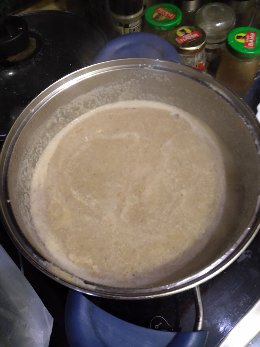 Из всей посредственности готовых блюд этой фирмы, данный суп можно поставить на второе место после шницеля из куриной грудки с моцареллой и картофельным пюре по балансу вкуса. Лично меня всегда смущало, что классика сама по себе довольно "тельное" и калорийное блюдо, а тут... Как то все не так. Потребовались месяцы, чтобы раскусить реальность за французким названием. Итого на гора вышло следующее: "Горячая грибная тюря с черным хлебом и молоком". Я только против вранья, и если, блюдо хорошо(а оно такое и есть), вот вообще не стоит скрывать его подноготную!. Приступим! Рецепт. 1. Куриный бульон -1,5 литра. На лаврухе и душистом перце. Кастрюля на 3-4 литра. 2. Грибы шампиньоны-300гр 3. Лук репка-100 4. Хлеб черный столичный-150гр 5. Молоко 3,5 - 300 мл 6. Сельдерей корень свежий-50 гр. 7. Чеснок 2 зубка(10 гр). 8. Масло сливочное - 50гр. 9. Глютамат натрия-1-1,5гр. 10. Соль 8 гр на литр супа. 11. Крупа кукурузная(это уже от меня!)-она реально делает суп пушистее и вкуснее -100-50гр. В