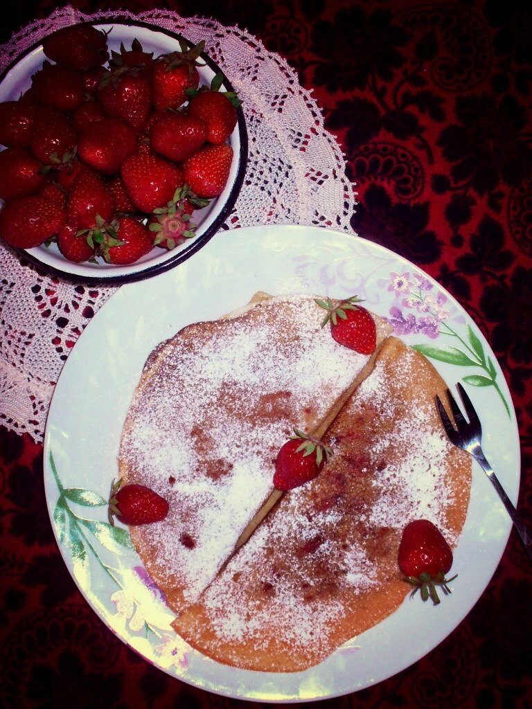 Очень часто, из доступных и не дорогих продуктов, получаются вкуснейшие блюда. Сегодня я приготовила творожные блинчики с клубникой, буквально из подручных средств) Поскребла по сусекам и вот прекрасный результат. Пышные, нежные, неимоверно вкусные блинчики с начинкой из свежей клубники. * 200 гр домашнего творога, щепотка соли, 3 ст ложки сахара, 100 гр йогурта ( питьевого), 200 гр теплой воды, 2 яйца, 1/2 чайной ложки соды, 2 ст ложки растительного масла. * Яйца, соль, сахар и творог взбить блендером, чтобы масса была однородной. Добавить йогурт, воду, хорошо перемешать. Постепенно добавлять муку, масло и соду, до получения блинного теста, консистенции густого кефира. Муки у меня ушло чуть больше стакана. Удобно пользоваться ручным венчиком, тогда тесто для блинов будет однородным, без комков. * Свежую клубнику нарезать пластинами. Разогреть блинную сковороду. Выливать порцию блинного теста, как только блинчик слегка схватился, убавить нагрев, выложить с одного края блинчика порцию н