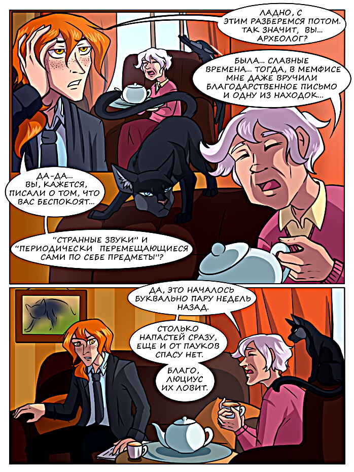 Дуэт рыжего полицейского и полубогини расследует загадочные городские происшествия в серии комиксов "Мой странный напарник". Многие сверхъестественные создания поселились среди людей с незапамятных времён. Но не все из них мирные. Дела, в которых замешаны мифические существа расследует спецотдел, где работают главные герои. Выпуски про их прошлые приключения читайте тут. Российская художница Джулия Голдфокс рассказывает читателям увлекательную и яркую историю, в основе которой египетские мифы и современные реалии. Если вам нравится аниме и всё сверхъестественное, этот комикс точно придётся вам по душе! Главы в истории объёмные, поэтому удобнее читать их по отдельным сюжетам. Например, вот сольный эпизод про будни богини войны Сехмет: В этом выпуске Ричард Редтейл отправился на задание в одиночку, ведь его напарница (и защитница) Нора занята бумажными делами. С его везением, рыжий парень влипает в очередное опасное приключение... Когда завёлся полтергейст В отдел поступило заявление от
