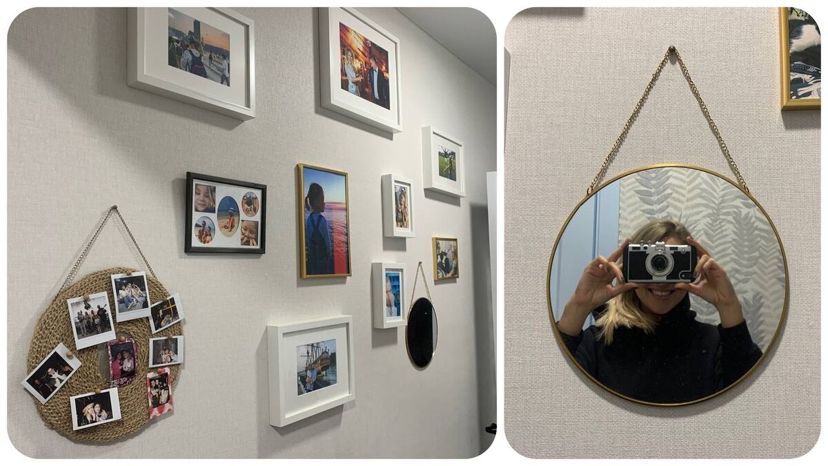 В своей квартире у меня была одна пустая длинная стена в коридоре, которая так и напрашивалсь завесить ее нашими семейными фото. Это натолкнуло меня на поиски идей. Начну с моей собственной стены с фотографиями. Я купила толстые рамки разного размера с паспорту и разместила их в хаотичном порядке. А чтобы они смотрелись не скучно, я разбавила стену латунью (обожаю латунь), а геометрию дополнила круглыми деталями. Здесь у меня поместилось круглое зеркало на подвесе с латуным обрамлением и круглое панно для паллоройд фото, которые я задумала прикреплять деревянными пинами (кнопками). Панно я смастерила сама, кстати. Это просто, покажу вам обязательно. Делюсь с вами, чего такого я нарыла и что же меня вдохновило. 1. Эстетичные углы Используйте каждый метр ваших пустых стен с пользой и красиво. Так можно декорировать не только внешние углы, но и внутренние, например, в лестничных пролётах. 2. Insta галереи Этих маленьких фото огромное количество и куда их столько! Полароиды не забыты,
