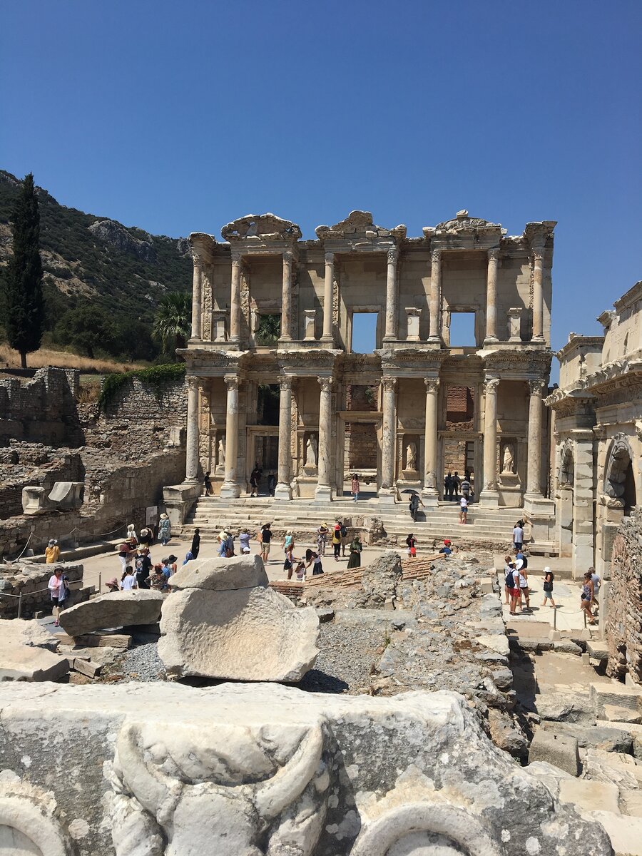 Эфес - древний античный город на побережье Средиземного моря. Он пережил и расцвет, и упадок, и войны, и землетрясения, был надолго заброшен и потерян. Эфес уникален тем, что это самый большой из сохранившихся древних античных городов. Здесь сохранилось множество археологических памятников, времен римского правления. Интересное древнеримское сооружение в Эфесе это ( Библиотека Цельсия), была построена Тиберием Юлием Аквилой. В библиотеке хранилось почти 12000 свитков, горожане приходили сюда читать. Сейчас от библиотеки остался лишь один двухъярусный фасад. В нишах между колонн расположены четыре женские скульптуры: "Премудрость", "Добродетель", "Мысль" и "Познание". Оригиналы вывезены в музей, а в нишах расположены копии.