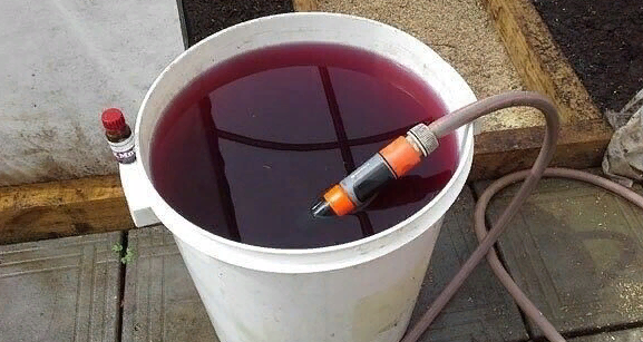 Сначала налейте треть стакана горячей воды в 10-литровое ведро. Возьмите по половине чайной ложки марганцовки и борной кислоты. Растворите их полност